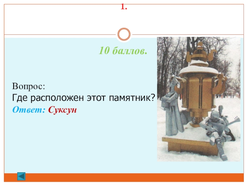 1.  10 баллов. Вопрос: Где расположен этот памятник?Ответ: Суксун