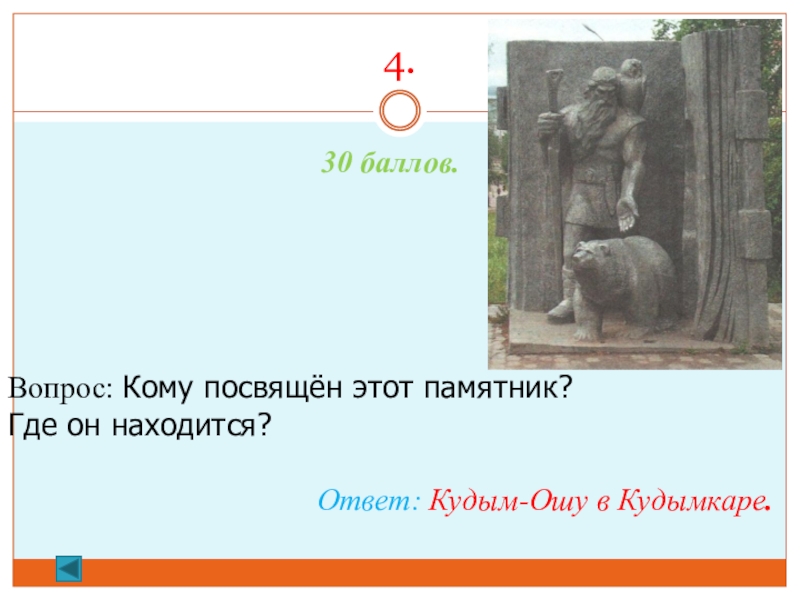 4. 30 баллов.Вопрос: Кому посвящён этот памятник? Где он находится?Ответ: Кудым-Ошу в Кудымкаре.