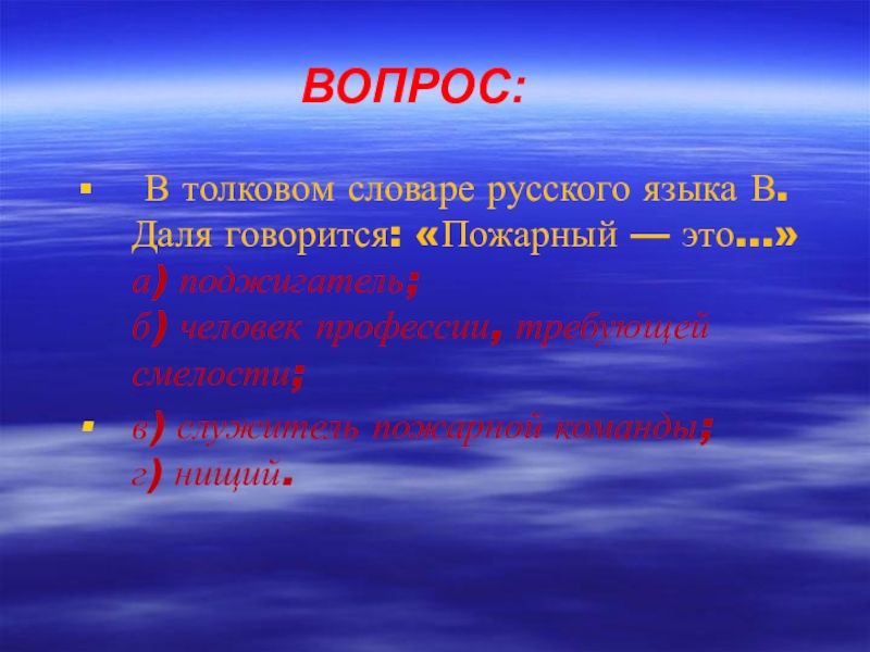 ВОПРОС: В толковом словаре русского языка В. Даля говорится: «Пожарный — это…» а) поджигатель; б) человек профессии,