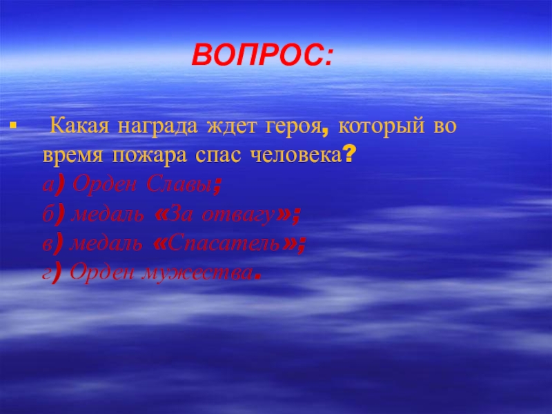 ВОПРОС: Какая награда ждет героя, который во время пожара спас человека? а) Орден Славы; б) медаль «За отвагу»;