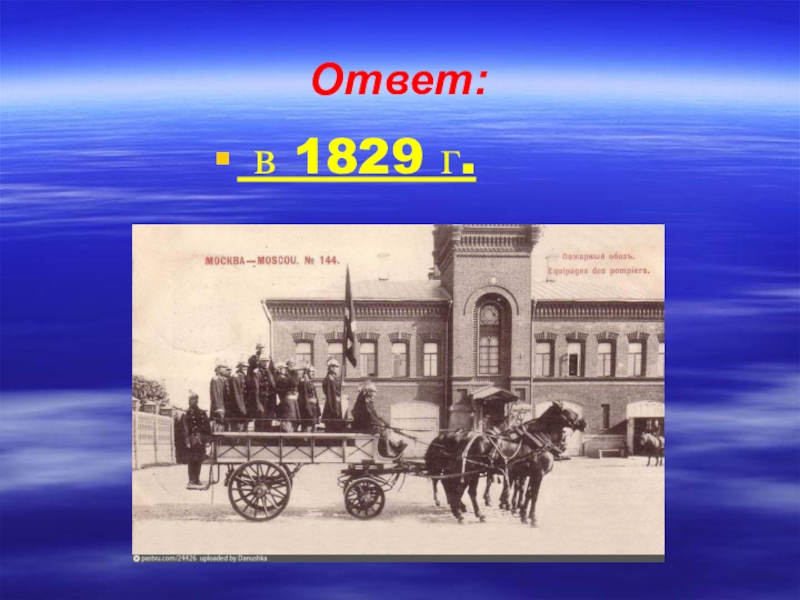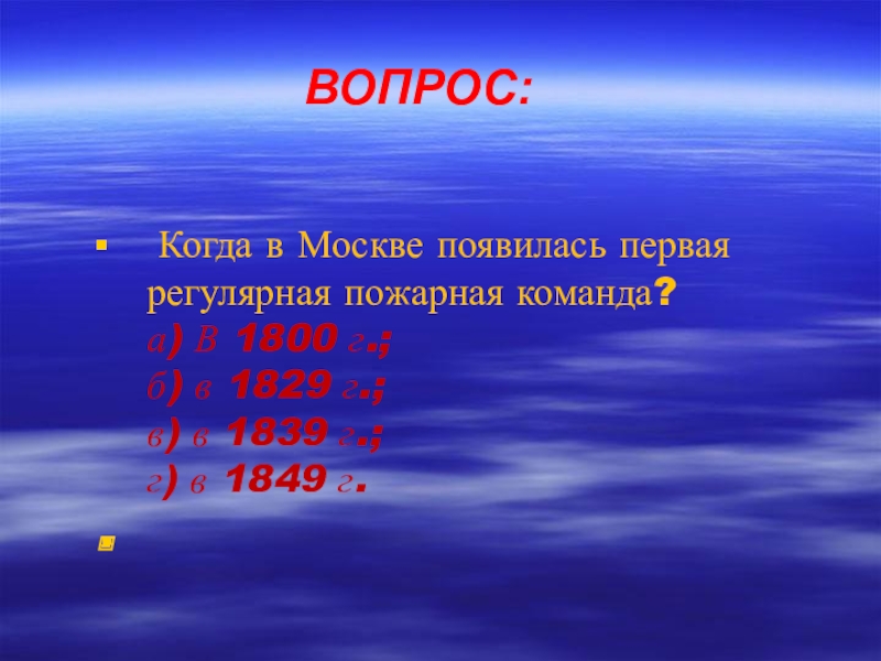 ВОПРОС: Когда в Москве появилась первая регулярная пожарная команда? а) В 1800 г.; б) в 1829 г.; в)