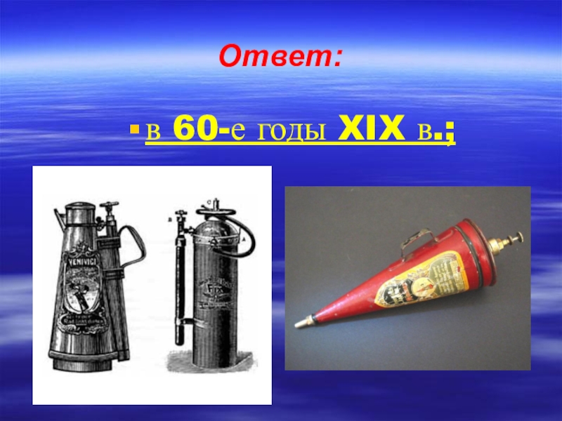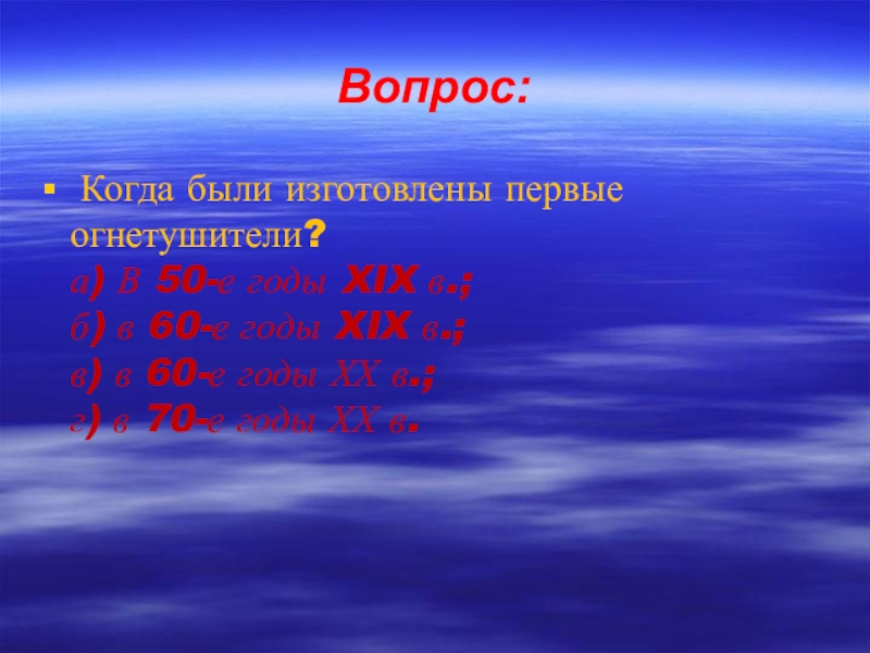 Вопрос: Когда были изготовлены первые огнетушители? а) В 50-е годы XIX в.; б) в 60-е годы XIX в.;