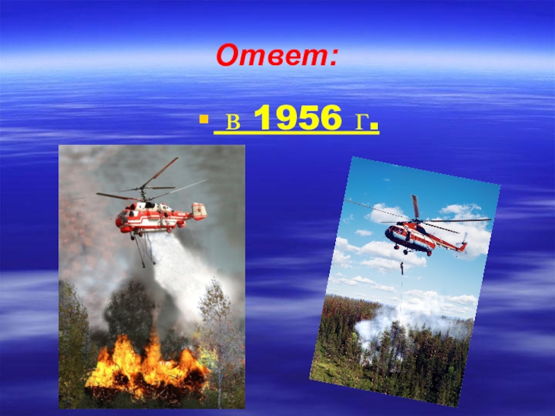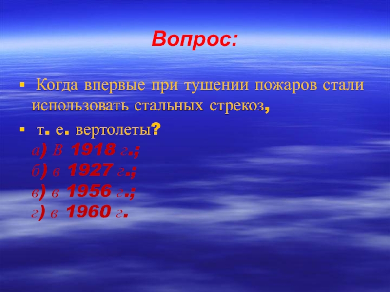 Вопрос: Когда впервые при тушении пожаров стали использовать стальных стрекоз, т. е. вертолеты? а) В 1918 г.;