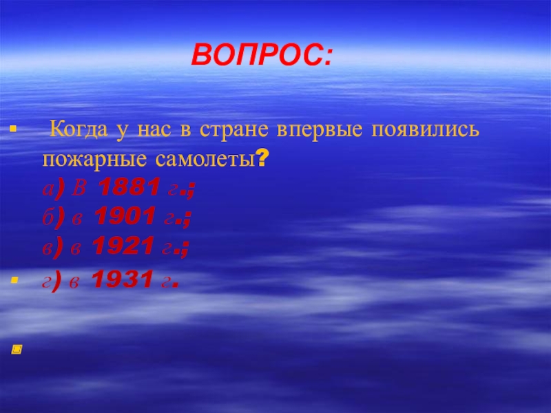 ВОПРОС: Когда у нас в стране впервые появились пожарные самолеты? а) В 1881 г.; б) в 1901