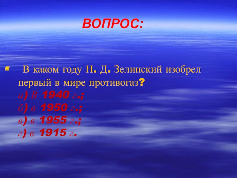 ВОПРОС: В каком году Н. Д. Зелинский изобрел первый в мире противогаз? а) В 1940 г.; б)