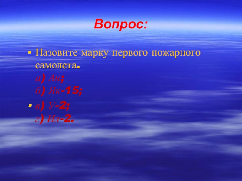 Вопрос:Назовите марку первого пожарного самолета. а) Ан; б) Як-15;в) У-2; г) Ил-2.