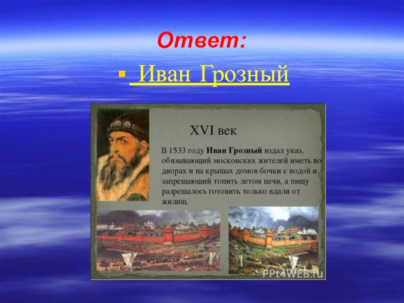 ВОПРОС: Кто первым в нашей стране издал закон о пожарной безопасности? а) Петр I; б) Иван Грозный; в)