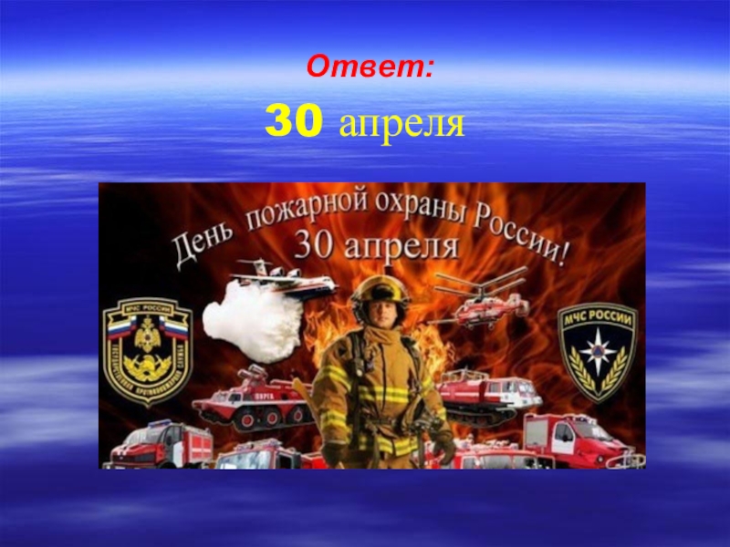 ВОПРОС: Когда пожарные России отмечают свой профессиональный праздник?а) 6 мая; б) 30 апреля;в) 8 марта; г) 12 июня.