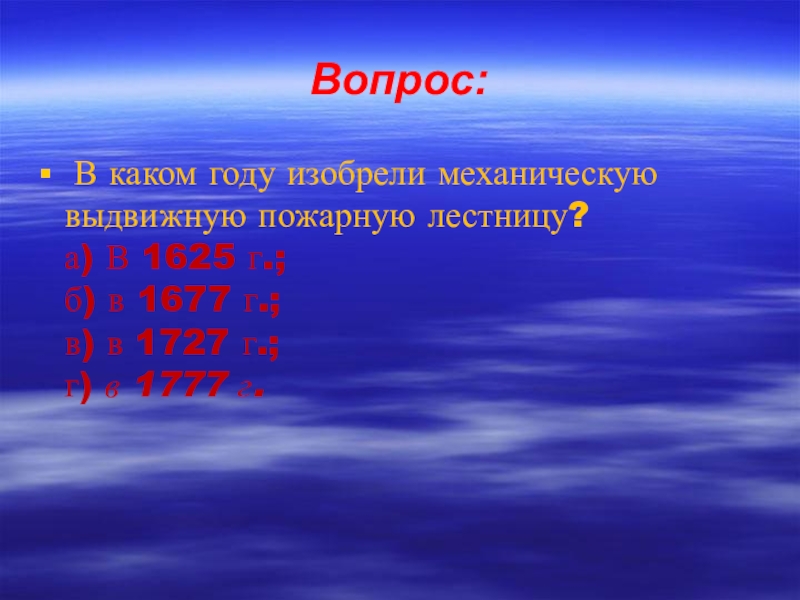 Вопрос: В каком году изобрели механическую выдвижную пожарную лестницу? а) В 1625 г.; б) в 1677 г.;