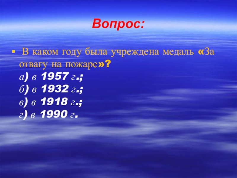 Вопрос: В каком году была учреждена медаль «За отвагу на пожаре»? а) в 1957 г.; б) в 1932