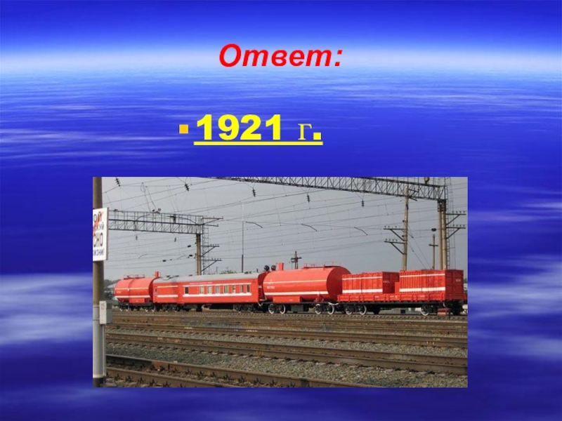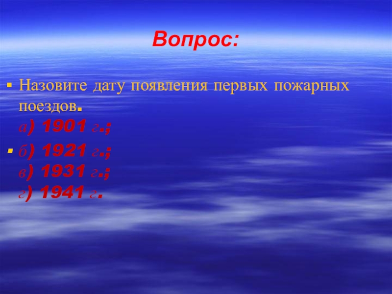Вопрос:Назовите дату появления первых пожарных поездов. а) 1901 г.;б) 1921 г.; в) 1931 г.; г) 1941 г.