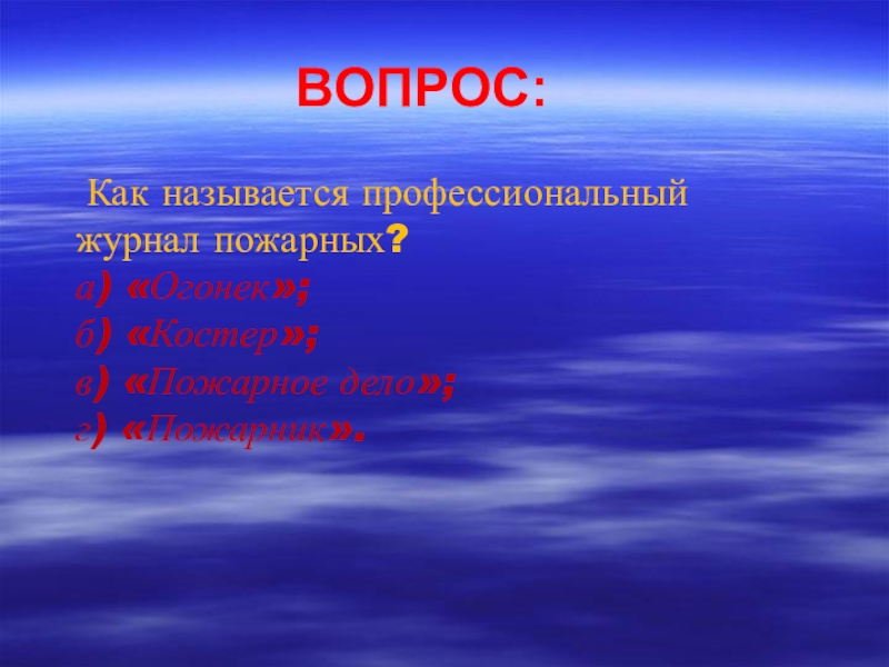 ВОПРОС: Как называется профессиональный журнал пожарных? а) «Огонек»; б) «Костер»; в) «Пожарное дело»; г) «Пожарник».