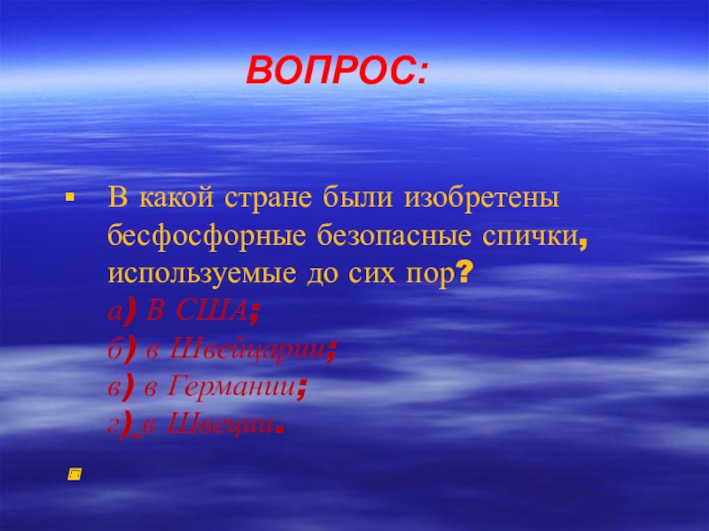 ВОПРОС:В какой стране были изобретены бесфосфорные безопасные спички, используемые до сих пор? а) В США; б) в