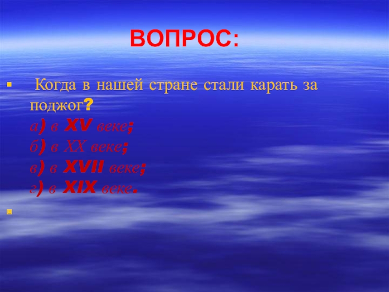 ВОПРОС: Когда в нашей стране стали карать за поджог? а) в XV веке; б) в ХХ веке; в)
