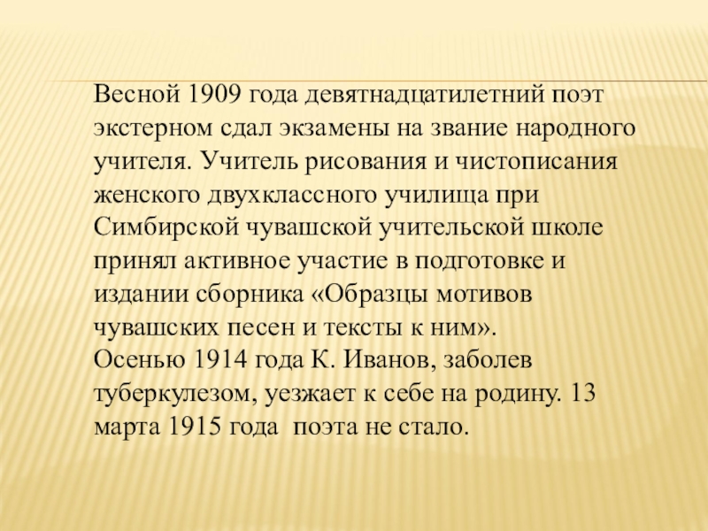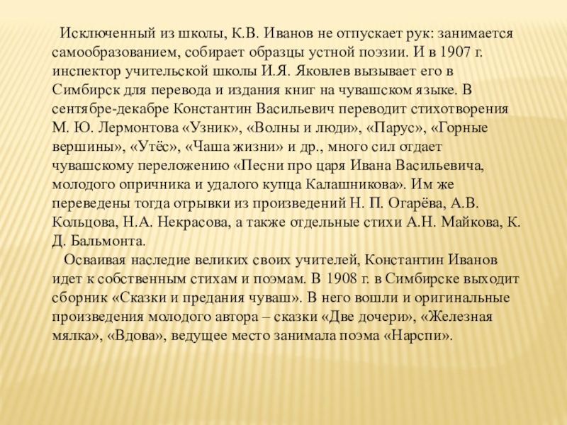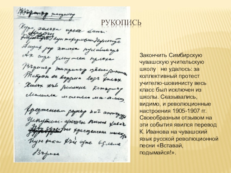 учителю-шовинисту весь класс был исключен из школы. Сказывались, видимо, и революционные настроения 1905-1907 гг. Своеобразным отзывом на эти события явился перевод К. Иванова на чувашский язык русской революционной песни «Вставай, подымайся!».