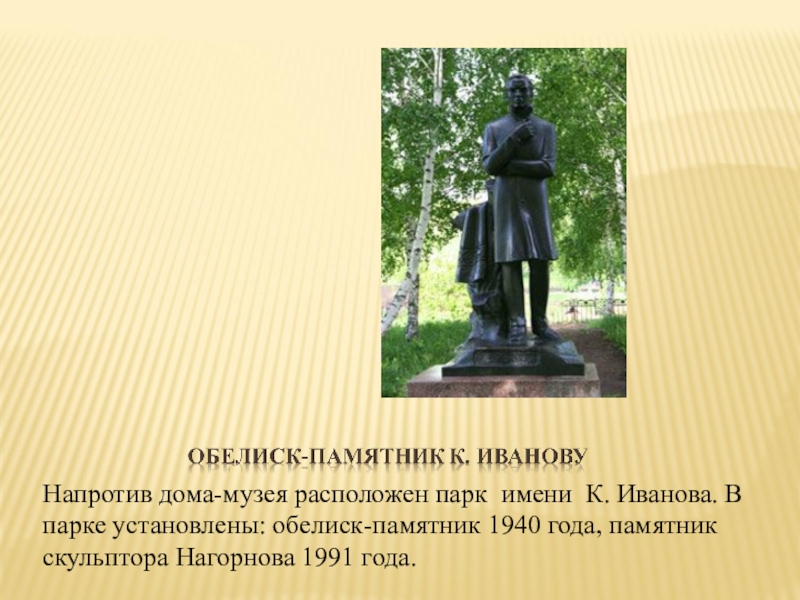 Слайд 36Напротив дома-музея расположен парк имени К. Иванова. В парке установлены: обелиск-памятник