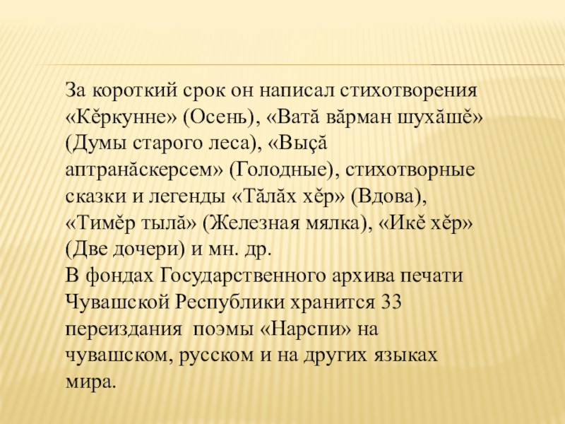 Слайд 25За короткий срок он написал стихотворения «Кěркунне» (Осень), «Ватă вăрман шухăшě»