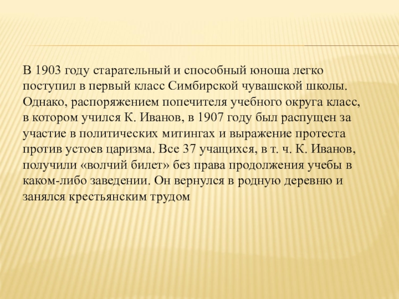 класс Симбирской чувашской школы. Однако, распоряжением попечителя учебного округа класс, в котором учился К. Иванов, в 1907 году был распущен за участие в политических митингах и выражение протеста против устоев царизма. Все 37 учащихся, в т. ч. К. Иванов, получили «волчий билет» без права продолжения учебы в каком-либо заведении. Он вернулся в родную деревню и занялся крестьянским трудом