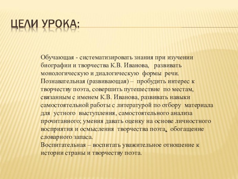 Слайд 4Обучающая - систематизировать знания при изучении биографии и творчества К.В. Иванова,