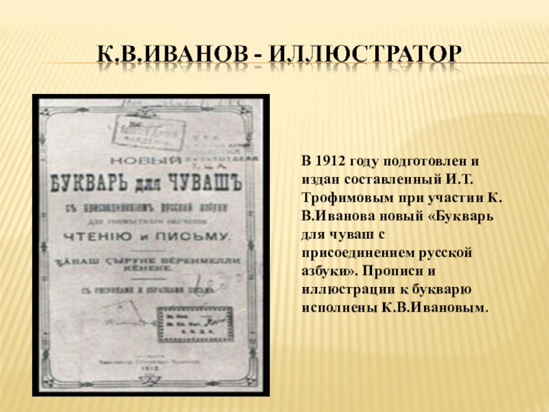 новый «Букварь для чуваш с присоединением русской азбуки». Прописи и иллюстрации к букварю исполнены К.В.Ивановым.