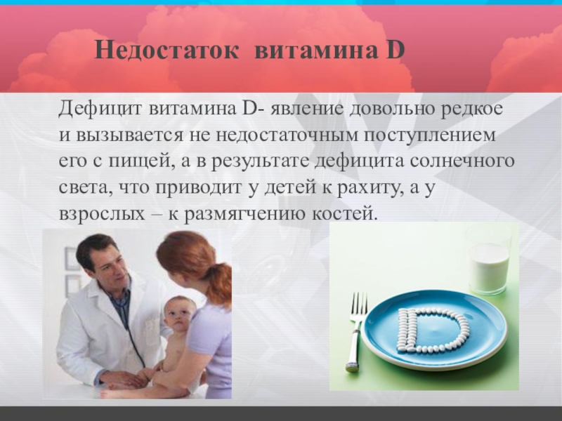 недостаточным поступлением его с пищей, а в результате дефицита солнечного света, что приводит у детей к рахиту, а у взрослых – к размягчению костей.