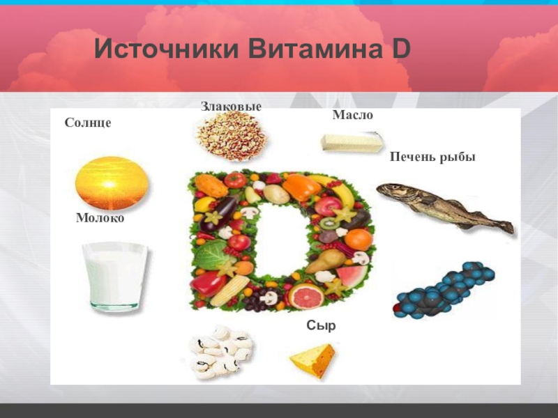 Источники Витамина DСолнцеМолокоЗлаковыеПечень рыбыСырМасло