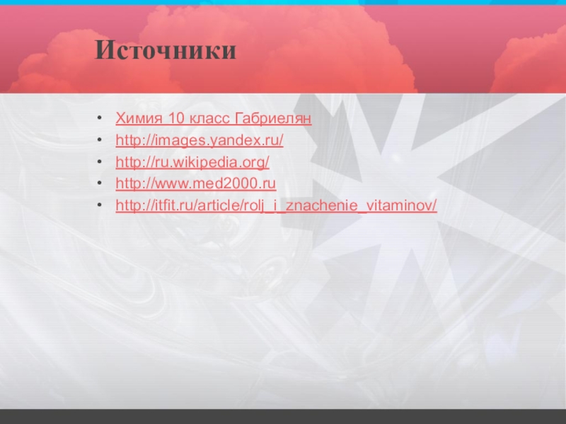 ИсточникиХимия 10 класс Габриелянhttp://images.yandex.ru/http://ru.wikipedia.org/http://www.med2000.ruhttp://itfit.ru/article/rolj_i_znachenie_vitaminov/