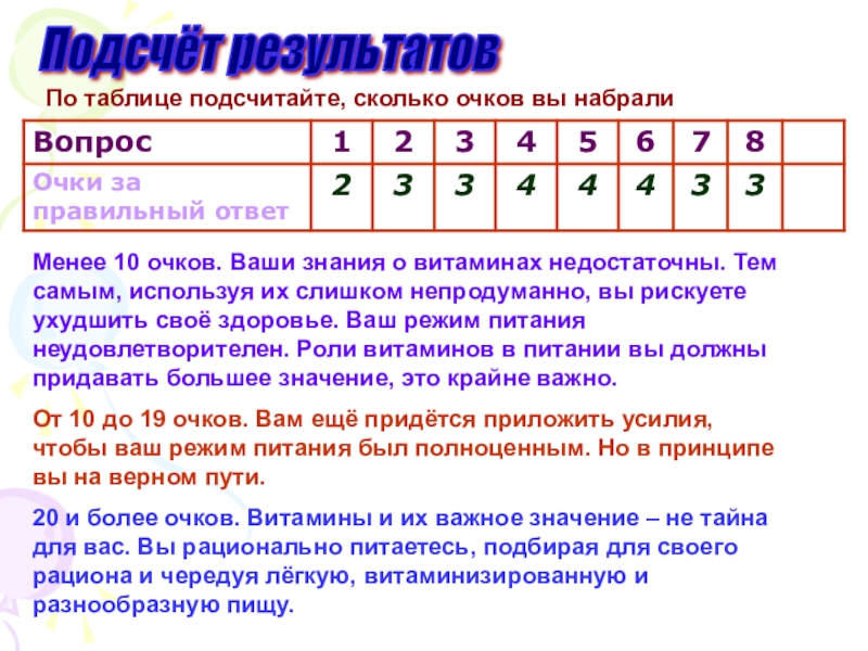 20 и более очков. Витамины и их важное значение – не тайна для вас. Вы рационально питаетесь, подбирая для своего рациона и чередуя лёгкую, витаминизированную и разнообразную пищу.