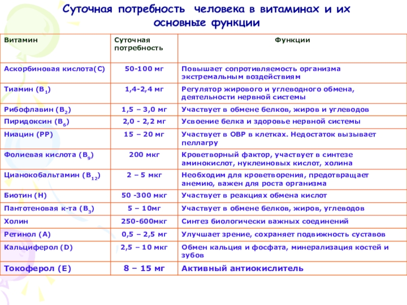 Слайд 36Суточная потребность человека в витаминах и их основные функции