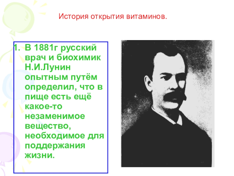Н.И.Лунин первым в 1880 году открыл причины болезней, связанных с неполноценным