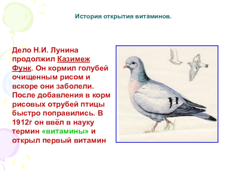 очищенным рисом и вскоре они заболели. После добавления в корм рисовых отрубей птицы быстро поправились. В 1912г он ввёл в науку термин «витамины» и открыл первый витамин