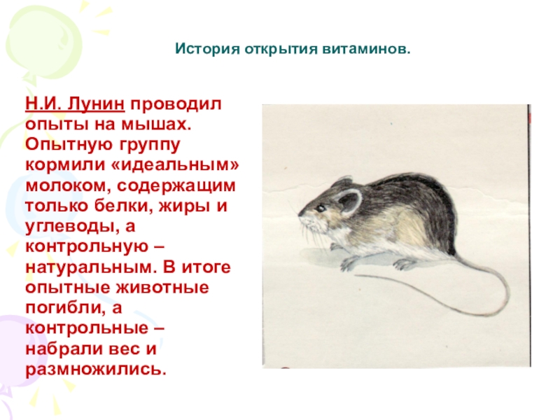 Н.И. Лунин проводил опыты на мышах. Опытную группу кормили