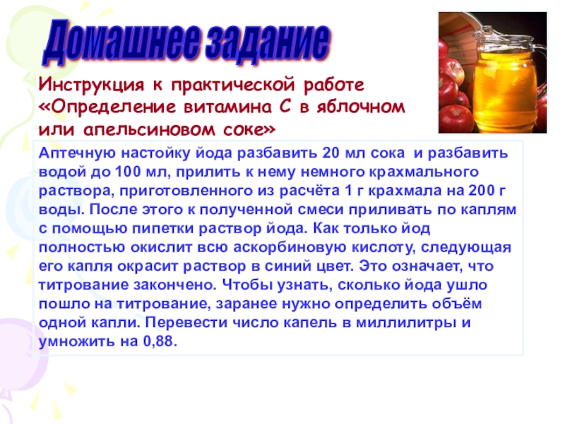 Аптечную настойку йода разбавить 20 мл сока и разбавить водой до 100 мл, прилить к нему немного крахмального раствора, приготовленного из расчёта 1 г крахмала на 200 г воды. После этого к полученной смеси приливать по каплям с помощью пипетки раствор йода. Как только йод полностью окислит всю аскорбиновую кислоту, следующая его капля окрасит раствор в синий цвет. Это означает, что титрование закончено. Чтобы узнать, сколько йода ушло пошло на титрование, заранее нужно определить объём одной капли. Перевести число капель в миллилитры и умножить на 0,88.