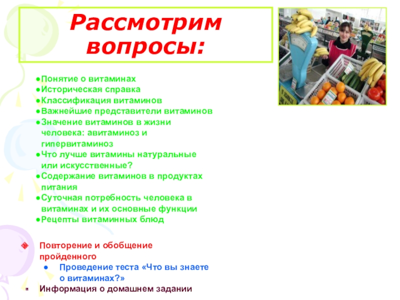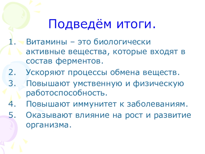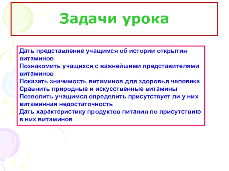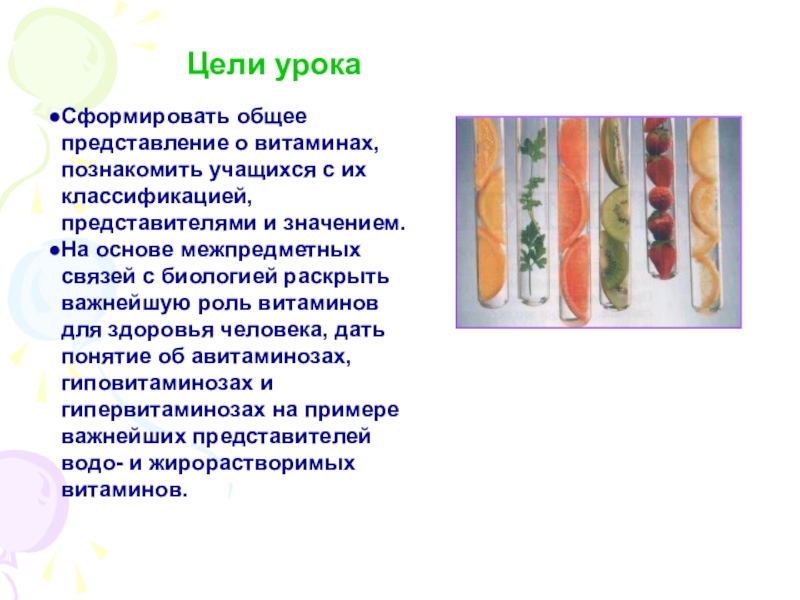 Сформировать общее представление о витаминах, познакомить учащихся с их классификацией,