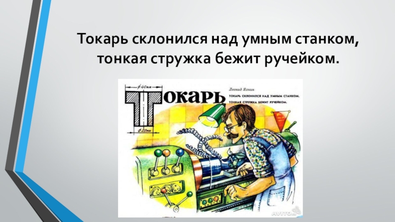 Слайд 11Токарь склонился над умным станком, тонкая стружка бежит ручейком.