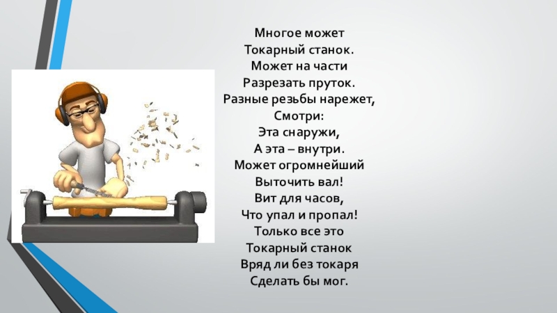 Слайд 12Многое может Токарный станок. Может на части Разрезать пруток. Разные резьбы нарежет, Смотри: Эта снаружи, А эта –