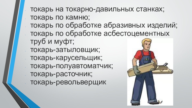 токарь на токарно-давильных станках;токарь по камню;токарь по обработке абразивных изделий;токарь по обработке асбестоцементных труб и муфт;токарь-затыловщик;токарь-карусельщик;токарь-полуавтоматчик;токарь-расточник;токарь-револьверщик