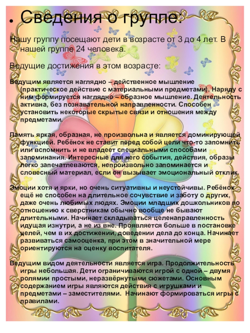 Сведения о группе:Нашу группу посещают дети в возрасте от 3 до 4 лет. В нашей группе 24 человека.Ведущие достижения в этом возрасте:Ведущим является наглядно – действенное мышление (практическое действие с материальными предметами). Наряду с ним формируется