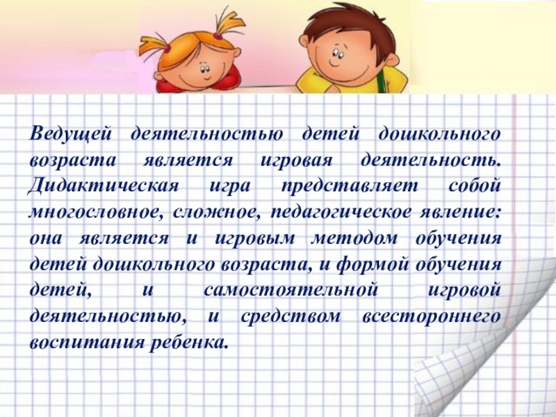 Слайд 2Ведущей деятельностью детей дошкольного возраста является игровая деятельность. Дидактическая игра представляет