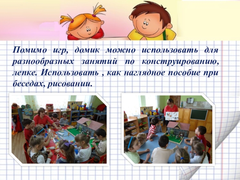 Слайд 10Помимо игр, домик можно использовать для разнообразных занятий по конструированию, лепке.