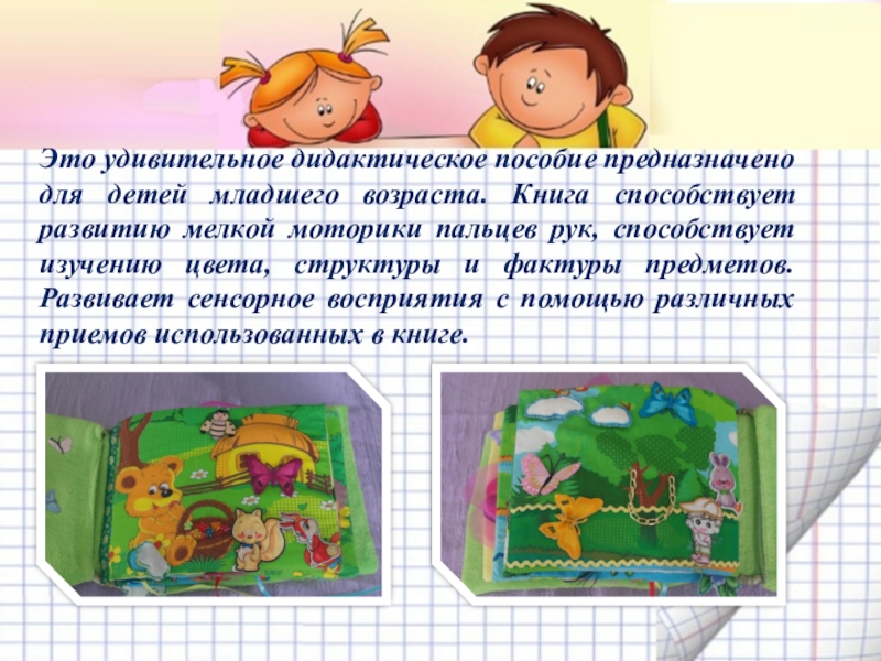 Слайд 6Это удивительное дидактическое пособие предназначено для детей младшего возраста. Книга способствует