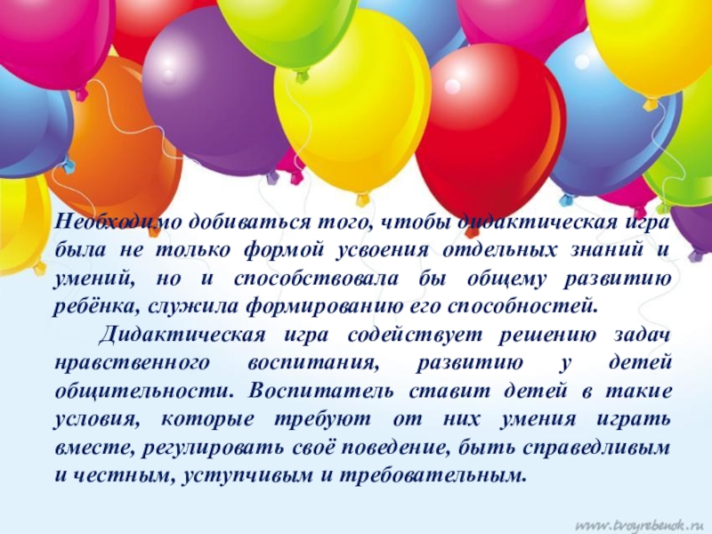 Дидактическая игра содействует решению задач нравственного воспитания, развитию у детей общительности. Воспитатель ставит детей в такие условия, которые требуют от них умения играть вместе, регулировать своё поведение, быть справедливым и честным, уступчивым и требовательным.