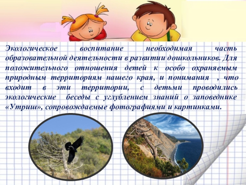 отношения детей к особо охраняемым природным территориям нашего края, и понимания , что входит в эти территории, с детьми проводились экологические беседы с углублением знаний о заповеднике «Утриш», сопровождаемые фотографиями и картинками.