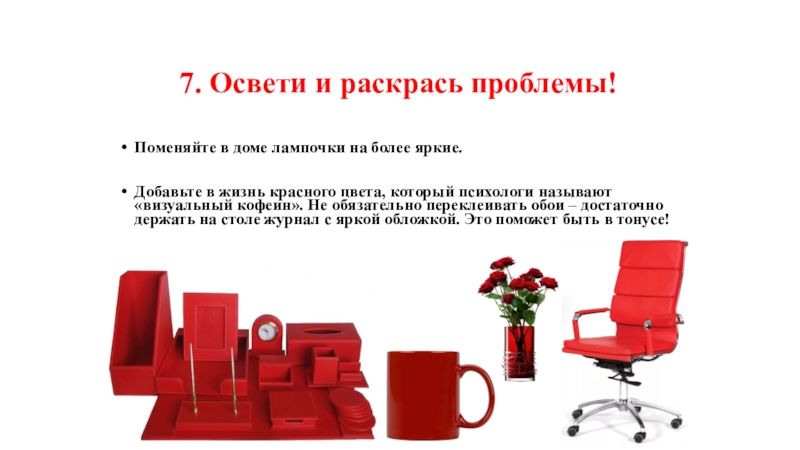 в жизнь красного цвета, который психологи называют «визуальный кофеин». Не обязательно переклеивать обои – достаточно держать на столе журнал с яркой обложкой. Это поможет быть в тонусе!
