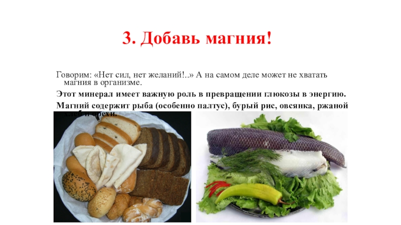 Магний содержит рыба (особенно палтус), бурый рис, овсянка, ржаной хлеб и орехи.