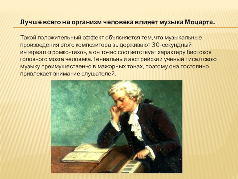 Слайд 11Лучше всего на организм человека влияет музыка Моцарта.