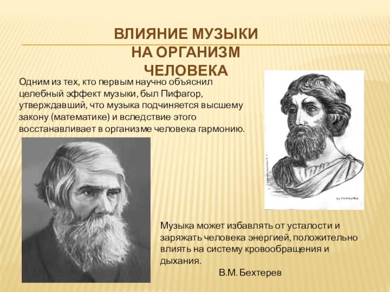 эффект музыки, был Пифагор, утверждавший, что музыка подчиняется высшему закону (математике) и вследствие этого восстанавливает в организме человека гармонию.