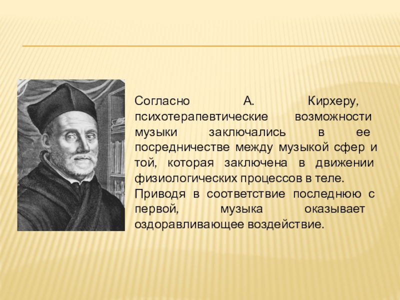 Слайд 15Согласно А. Кирхеру, психотерапевтические возможности музыки заключались в ее посредничестве между