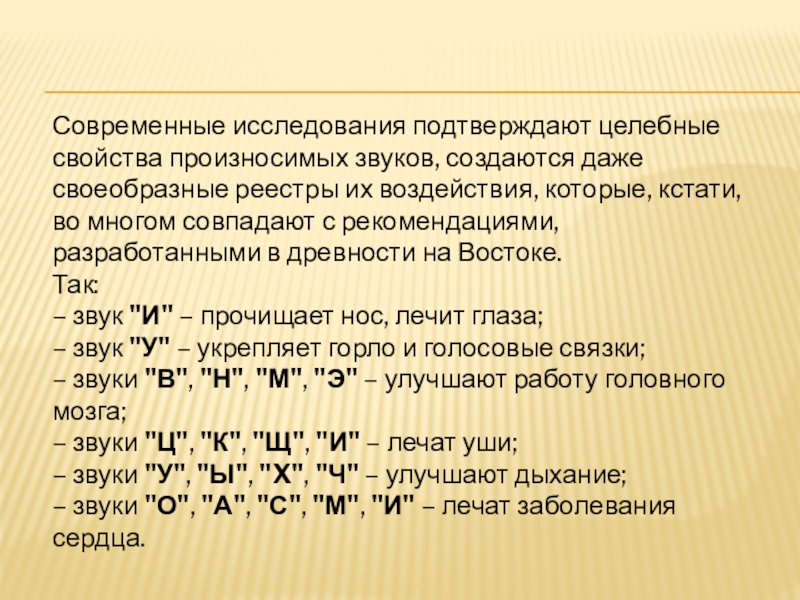 Слайд 16Современные исследования подтверждают целебные свойства произносимых звуков, создаются даже своеобразные реестры