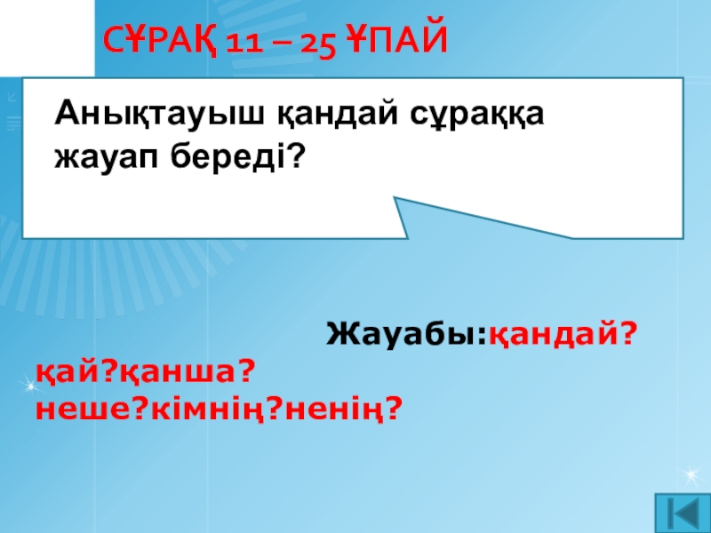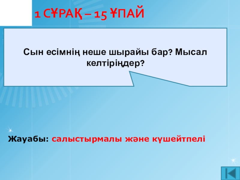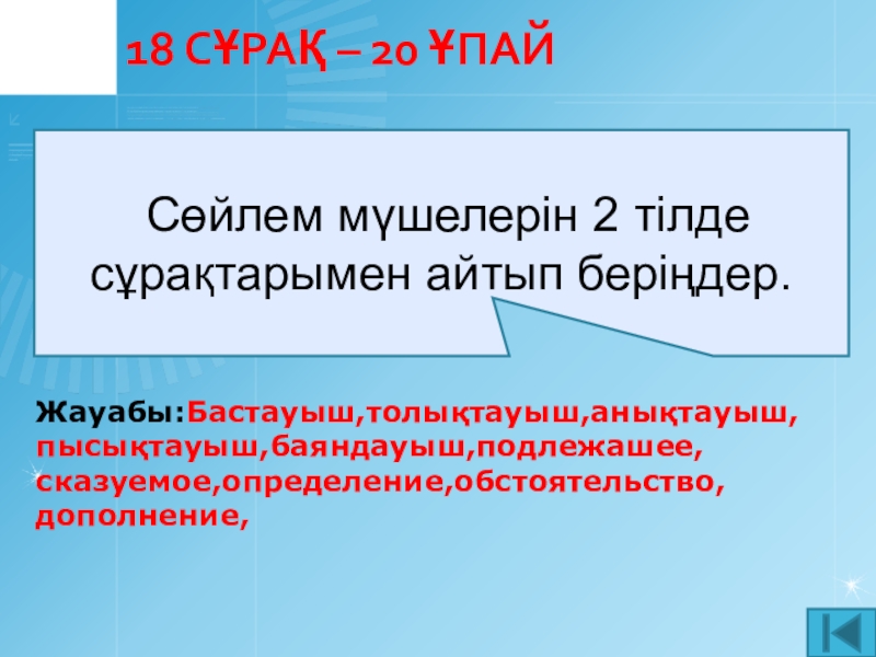 Жауабы:Бастауыш,толықтауыш,анықтауыш,пысықтауыш,баяндауыш,подлежашее,сказуемое,определение,обстоятельство,дополнение,
